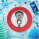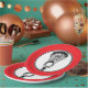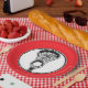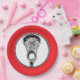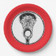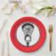 Lacrosse Party- oder Teamevent-Teller mit laxer Strichkunst auf rotem Hintergrund.