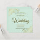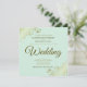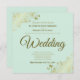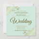 Die Einladung zur Hochzeit ist mit einem hellgrünen oder neo-mintfarbenen Hintergrund versehen, der mit lackierten Imitaten goldene Gürtel und Wirbel in den Ecken zeigt. Die Formulierung ist formell mit elegantem Drehbuch Goldschrift.