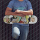 Maßgeschneidertes Skateboard mit einer Bildvorlage von vier Fotos in schrägen Formen ohne Text.