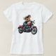 This is a digital illustration in a realistic style depicting a young woman with long brown hair, wearing sunglasses, a black tank top, and blue jeans, riding a red motorcycle. She has a focused expression and her hair is blowing in the wind. The motorcycle has chrome details, and the background is a light, textured beige. The image captures a sense of freedom and adventure.