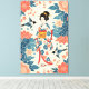 This image is a vibrant and stylized illustration featuring a woman in traditional Japanese attire, specifically a kimono patterned with large floral and leaf motifs. The overall style is strongly reminiscent of Ukiyo-e woodblock prints, but with a modern, cleaner aesthetic, and a color palette that suggests Bingata dyeing from Okinawa.