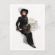 Hübsche Frau in schöner Vintager, schwarzer Kleidung sitzend mit ihren Paketen und Geschenken. Ihr kleiner Hund ist auf ihrem Schoß stehend. Wunderbares Viktorianisches Bild.