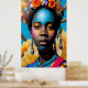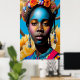 Ein Bild einer blauen Dame mit Muscheln und Blume auf ihrem Haar. Dies ist ein künstlerisches Kunstwerk mit Blumenmotiv.