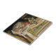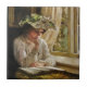 Viktorianische Frau, die einen modischen Hut trägt, sitzt am Fenster und liest. Wenn man durch das Fenster blickt, sieht man weiche rosa Rosen. Bildende Kunst von Thomas Kinnington c1889.