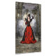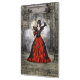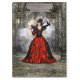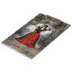 3D digitale Darstellung eines schönen weiblichen Zauberers in einem roten und schwarzen Kleid mit Flügeln auf einem fantasievollen Schlosshintergrund