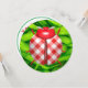 Ein roter und weißer Gingham-Karo ladybug ist Set vor einem hellgrünen Hintergrund aus Tönchengras. Kann für ein Picknick, ein Party für kleine Mädchen oder eine Babydusche verwendet werden.