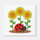 Dieses Design ist von einem lächelnden roten Ladybug stehend vor einer Gruppe von gelben und orangefarbenen Sonnenblumen.