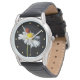 Spaß Armbanduhr mit einem Foto einer Daisy mit einem Ladybug auf schwarzem Hintergrund mit gelben Punkten für die Stunden.