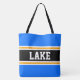 Dieses sportliche, sportliche Design zeichnet sich durch feinen LAKE-Text in einem farblich hervorgehobenen breiten, mittleren schwarzen Streifen mit weißen und gelben pinstripes gegenüber den hellblauen äußeren Streifen aus. Der Text kann personalisiert sein.