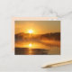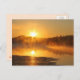 Foto eines Sees mit Nebel oder Nebel während eines Sonnenaufgangs, auf einer Postkarte angezeigt.
