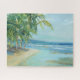 "Blue Coastal Lagoon" von Suzanne Wilkins. Ein ruhiger Strand mit tropischen Bäumen.