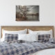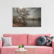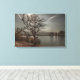 Ein Baum am Seeufer, der teilweise die Sonne blockiert. Gebirge sind an der äußersten Küste zu sehen. Die HDR-Verarbeitung bringt zusätzliche Details und Tiefe.