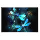 Zwei lichtdurchflutete, türkisfarbene, kunstvoll gezeichnet Libellen mit lichtdurchlässigem Sealgen und Glühwürmchen im Hintergrund. Glühende Libelle.