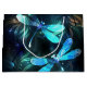 Zwei lichtdurchflutete, türkisfarbene, kunstvoll gezeichnet Libellen mit lichtdurchlässigem Sealgen und Glühwürmchen im Hintergrund. Glühende Libelle.
