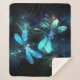 Zwei lichtdurchflutete, türkisfarbene, kunstvoll gezeichnet Libellen mit lichtdurchlässigem Sealgen und Glühwürmchen im Hintergrund. Glühende Libelle.