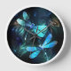 Zwei lichtdurchflutete, türkisfarbene, kunstvoll gezeichnet Libellen mit lichtdurchlässigem Sealgen und Glühwürmchen im Hintergrund. Glühende Libelle.