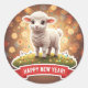 Adorable realistic lamb standing on a small hill with colorful confetti and tiny sparkling New Year lights. Bright and photorealistic Happy New Year sticker