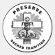 Mit einer wunderschönen, traditionell katholischen Schwarz-Weiß-Kunst, die von einem Lamm auf dem Altar gezeichnet wird, mit dem Text PRÄVE SACRED TRADITION.