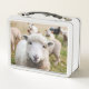 In dieser Lunchbox ist ein niedliches Lamm abgebildet.