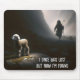Ein sanfter Glanz hebt eine surreale Szene eines verlorenen Lamms hervor, das auf felsigem Boden stehend ist und von dem ein Hirte hinter einem Stab folgt