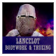 Nahaufnahme eines Helms und einer Plattenrüstung eines mittelalterlichen Ritters vor dem farbenprächtigen Hintergrund, der den Weltraum oder ein Schlachtfeld nach Ihren Wünschen imitiert. Text - Lancelot - Körperarbeit & Vertrauen - hinzugefügt