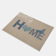 Patchworkbuchstaben mit blauem und weißem Blumenherzformulierung Zuhause in diesem hübschen Landartentwurf auf einem rustikalen Leinwandeffekt-Leinenhintergrund. Zusätzliche Details eines blauen Schmetterlinges und weißen Blumendes rollemusters. Entworfen durch Lerchen-Entwürfe