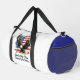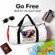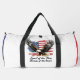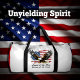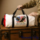 This white duffle bag features a powerful patriotic design with a majestic bald eagle in flight against a distressed American flag backdrop. The text "Land of the Free Because of the Brave" is prominently displayed below. This design is perfect for showing pride and gratitude for American freedom and military service. Edit color of the bag caps and body in the Design tool to your favored colors.