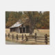 Eine Fotografie einer Landszene, die eine verwitterte Scheune und defekten einen Schienenzaun kennzeichnet.