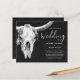 Mit den Einladungen zum Hochzeitsfest im Stier-Schädel-Western laden wir Sie zu einem besonderen Tag ein. Rustikaler Texturhintergrund zum Anpassen Ihrer Informationen. Bildrecht Marg Seregelyi Fotografie.