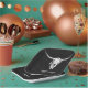Mit den Tellern aus schwarz-weißem Western des Hauses Rodeo Bull Skull-Papier laden Sie Ihre Gäste zu einem besonderen Tag ein. Schöner rustikaler Texturhintergrund, um Ihre Informationen mit bedrückter weißer Typografie anzupassen. Bildrecht Marg Seregelyi Fotografie.