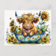 Eine bezaubernde Grußkuh mit einer Postkarte, die für das Hochland von Kalb mit Sonnenblumen entworfen wurde