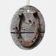 Diese hängende Verzierung kennzeichnet das Bild eines alten Hufeisens mit rotem Rost auf seiner Oberfläche. Das Hufeisen hängt an einer alten Wand der geknoteten hölzernen Planken des Alterns Silber. Der Entwurf ist auf einer hängenden Verzierung, die für den Weihnachtsbaum ideal ist.