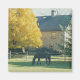 Ein sanft weidendes Pferd vor einem Steinhaus und einem gelben Baum.