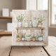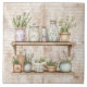 Diese Keramik Kachel verfügt über ein rustikales Bauernregal mit Töpfen, Vasen und Kräutern. Das Design ist mit einem sanft gealterten Pergament-Hintergrund, Schrift-Handschrift und skizzenhaften Blumendetails bereichert und verleiht ihm einen zeitlosen, alten Charme. Mit seinen warmen Farbtönen und der rustikalen Textur verbindet dieses Stück Bauernhaus, Bauernhof und die französische Landesästhetik.