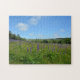 Landschaft mit Lupinen auf grüner Wiese und blauem Himmel, im Hochrhein, Deutschland