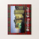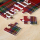 Das landschaftliche Puzzle bietet Stirling Castle, das in der Nacht in Schottland, Großbritannien, beleuchtet wird. Digitale "Aquarelleffekte", die dem ursprünglichen Foto hinzugefügt wurden, Clan Stewart tartan border