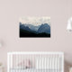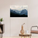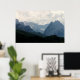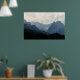 Ein Poster mit einem Foto von schönen Bergen, bewölktem Himmel und sanften Hügeln voller Bäume im Vordergrund. Graublau.