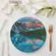 Papier Teller mit einem schönen Foto mit einer schönen Bergkette, grau und rostfarben. Ein grüner, üppiger Wald umgibt einen ruhigen, klaren See. Schönes Outdoorsie-Bild.
