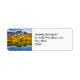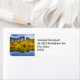 Adressieren Sie Labels mit einem schönen Landfoto. Steinberge mit einem Herbstwald in lebhaften Farben. Ein ruhiger See reflektiert die Berge, Bäume und Gräser.