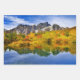 Papierblätter mit einem schönen Landfoto umhüllen. Steinberge mit einem Herbstwald in kräftigen Farben. Ein ruhiger See reflektiert die Berge, Bäume und Gräser.