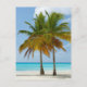Eine Postkarte mit einem schönen und ruhigen Foto von 2 Palmen unter einem hellblauen Himmel. Stehend an einem abgeschiedenen tropischen Strand mit türkisblauem Wasser.