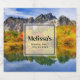Geburtstag Veranstaltung Flasche Etiketten mit einem schönen Landfoto. Steinberge mit einem Herbstwald in lebhaften Farben. Ein ruhiger See reflektiert die Berge, Bäume und Gräser.