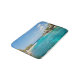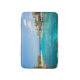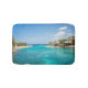 Eine Badematte mit einem schönen Foto mit einem tropischen Badeort. Hübsches blaues Wasser und weißer Sandstrand mit Strohhütten geben ihm eine ruhige Inselatmosphäre.