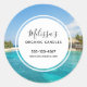 Business Aufkleber mit einem schönen Foto mit einem tropischen Badeort. Hübsches blaues Wasser und weißer Sandstrand mit Strohhütten geben ihm eine ruhige Inselatmosphäre. Ein weißer Kreis, oben mit dem Text, der sich darin befindet.