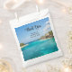 Taschen mit einem schönen Foto mit einem tropischen Badeort. Hübsches blaues Wasser und weißer Sandstrand mit Strohhütten geben ihm eine ruhige Inselatmosphäre. Ein weißer Kreis, oben mit dem Text, der sich darin befindet.