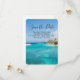 Bei Hochzeiten sparen Sie die Dattelkarte mit einem schönen Foto mit einem tropischen Badeort. Hübsches blaues Wasser und weißer Sandstrand mit Strohhütten geben ihm eine ruhige Inselatmosphäre.