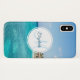 Casemate Telefonzelle mit einem schönen Foto mit einem tropischen Badeort. Hübsches blaues Wasser und weißer Sandstrand mit Strohhütten geben ihm eine ruhige Inselatmosphäre. Ein weißer Kreis überlagert mit Ihrem Namen und einem Monogramm, das sich im Inneren befindet.