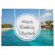 Herzlichen Glückwunsch zum Geburtstag mit einem wunderschönen Foto mit einem tropischen Badeort. Hübsches blaues Wasser und weißer Sandstrand mit Strohhütten geben ihm eine ruhige Inselatmosphäre. Ein weißer Kreis, oben mit dem Text, der sich darin befindet.