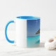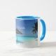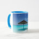Landschaftlicher tropischer Strand mit Strohschirm Tasse