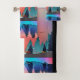 Handtuchhandtuch Set mit schönem grafischem Design mit einem friedlichen See mit Reh. und hohen Kiefern, die sich im Wasser widerspiegeln. Sterne schweben über.